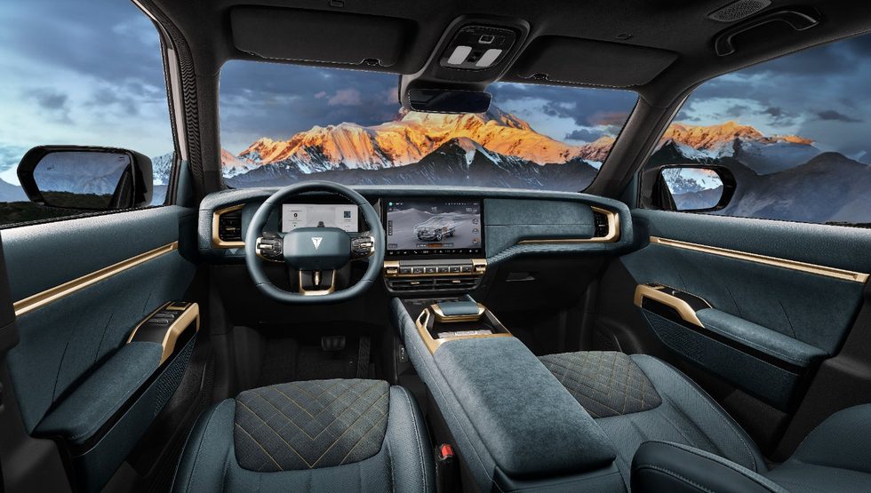 内饰方面,深蓝G318的座舱设计灵感来自于"星际穿越舱",融入了诸多赛博科技元素,营造出独特的未来感。中控台、门板和座椅等部位大量采用翻毛皮材质进行包覆,同时配以对比色饰条点缀,使整体内饰充满质感。此外,新车还配备了12.3英寸的全液晶仪表盘和14.6英寸的内嵌式中控大屏和三辐式多功能方向盘。同时,它还保留了中控台控制区域的一些实体按键,这不仅营造出较强的科技感,也提升了实用性。