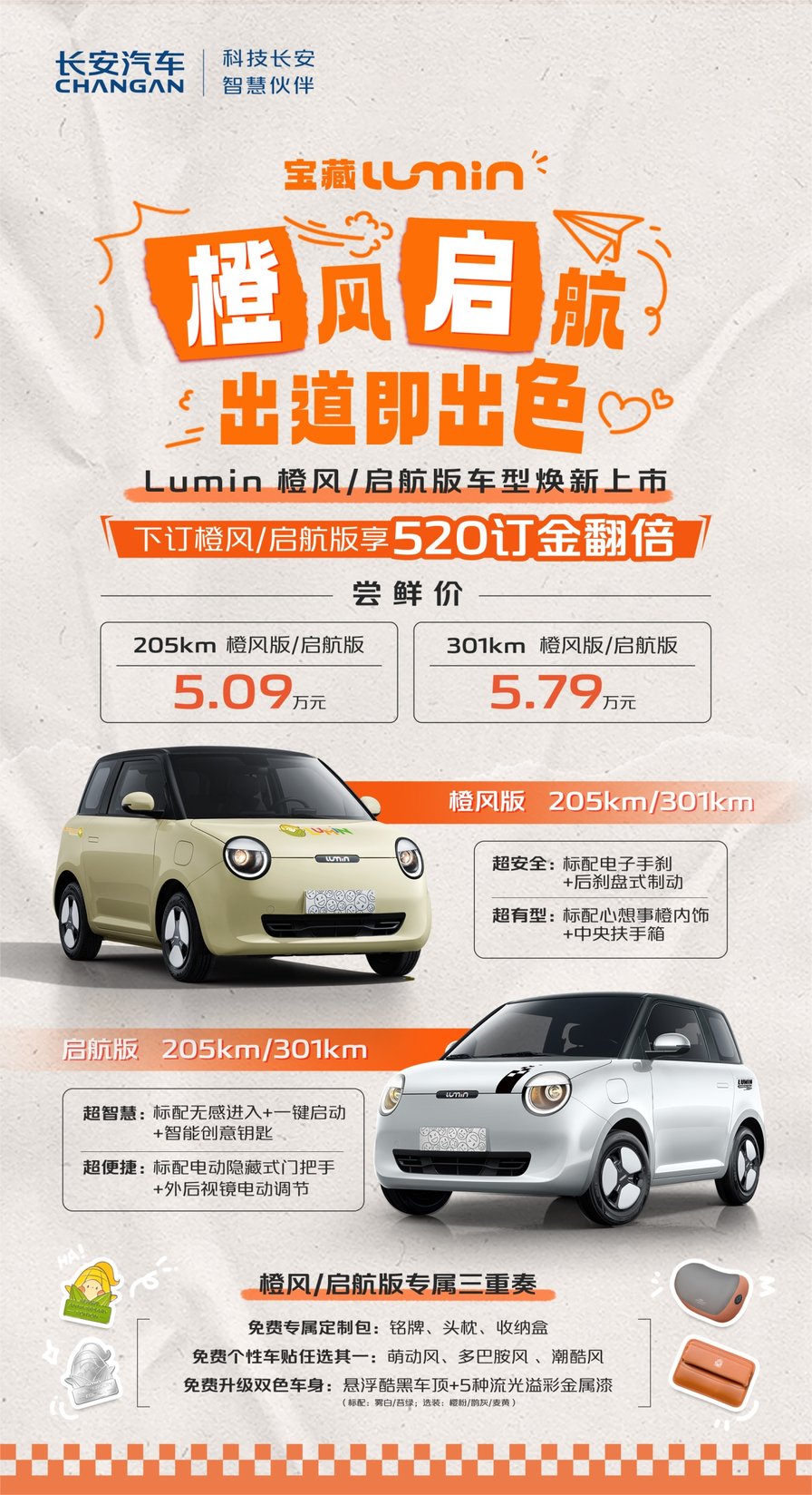 乘风破浪潮头立,扬帆起航正当时。橙风版、启航版两款不同配置也正是长安汽车对Lumin的美好愿景。两款车型分别设有205km和301km两个续航版本。虽然在配置上有所不同,但在价格上同续航的两款车售价一致。205km橙风版/启航版,尝鲜价5.09万元;301km橙风版/启航版,尝鲜价5.79万元。