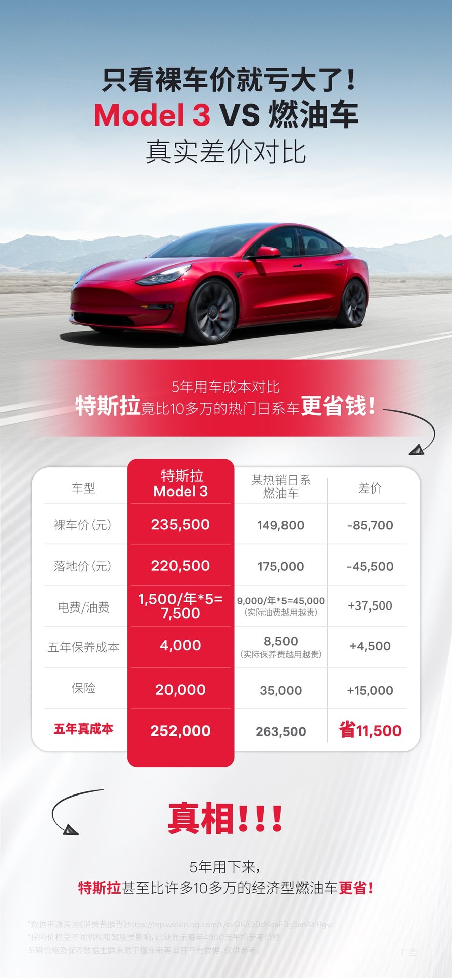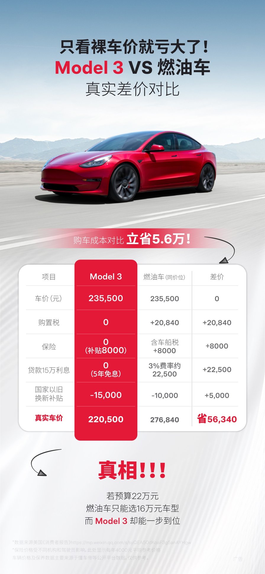从购买成本看,两款车裸车价都是235500元,但是特斯拉的优势就很明显了。
