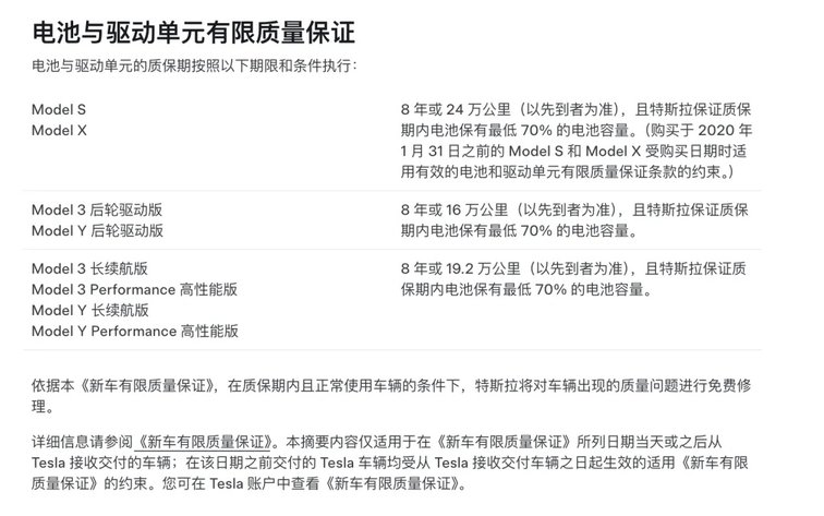 无数车主的真实用车经历验证了特斯拉电池的耐用性,同时,特斯拉电池的超长质保还给车主们吃下了一颗“定心丸”。据悉,特斯拉还为在售车型提供了最长8年24万公里(根据车型有所差异,以先到者为准),电池容量不低于70%的质量保证。