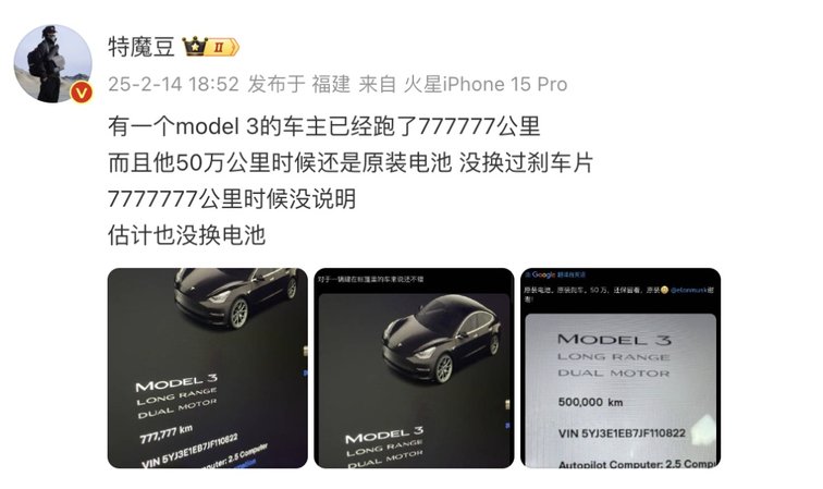 除此之外,最近,博主@特魔豆 分享了一位海外Model 3车主的真实用车经历,他的车目前累计行驶里程已经达到77万公里。“据了解,行驶至55万公里时,车辆依然使用原装的电池与刹车片,产品表现还是很能打!”