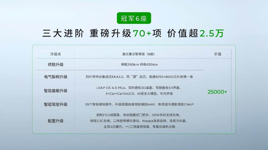 作为零跑汽车的旗舰车型,2024款C16上市即引爆市场,以20万内6座SUV销量冠军的姿态,印证了“以用户为中心”的产品理念。此次2026款冠军6座版携70余项升级重磅归来,通过舒适进阶、续航进阶、智能进阶三大维度,实现超2.5万元价值跃升。