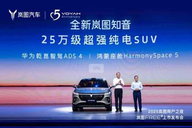 随着7月12日岚图FREE+以21.99万元起正式上市,在15分钟内便收获过万订单的成绩,岚图汽车也正式开启“2025产品连击战”。在7月12日发布会现场,不仅有25万内唯一中大型SUV岚图FREE+的上市,还有25万级超强华为纯电SUV全新知音的亮相,这也是自该车公告图曝光后的首次亮相,华为智能汽车解决方案BU CEO靳玉志甚至为该车站台。据悉,全新岚图知音将于8月底正式上市。