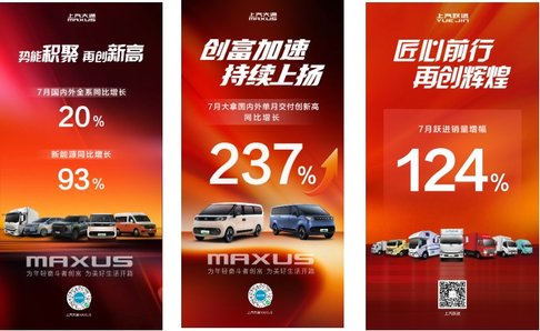全品类协同进击。皮卡在越野爱好者与创富创业者中持续热销,7月销量达5,438辆,同比增长28%。8月,上汽大通更将推出皮卡家族焕新车型——“第一台全国不限行的越野皮卡”星际X真乘用版、“科技性能旗舰皮卡”星际X EV和“10万内最高质价比皮卡” 2026款星际L。新车将全面升级动力与装载能力,引发市场期待。跃进轻卡系列同样表现不俗,7月销量增幅高达124%!凭借强承载、高可靠的特性,成为城乡物流运输的得力助手。MPV已获得30万用户的青睐,在香港等竞争激烈的市场取得销量冠军的佳绩。作为国内第一家达到万辆级房车规模的企业,上汽大通在房车市场更引领用户进入“房车2.0时代”。