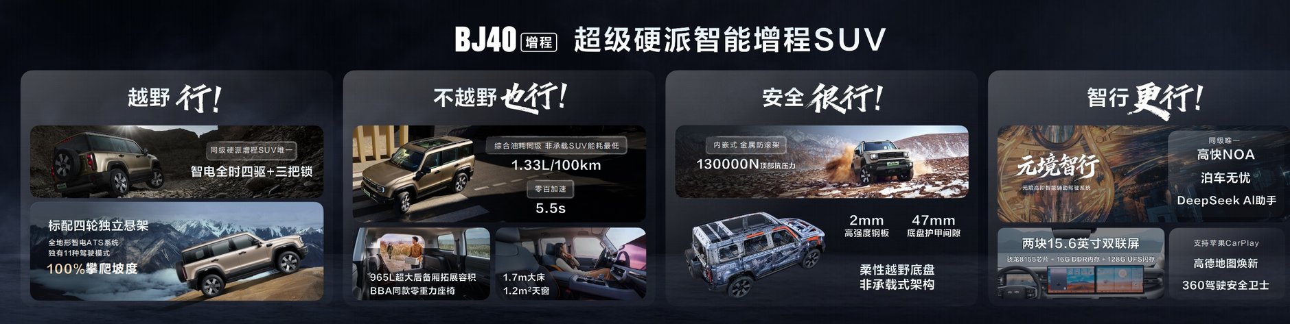 北京越野董事长王昊表示,作为中国越野车发明者,北京越野开创了属于中国人自己的越野车品类。BJ40增程为全球用户开辟了一个全新品类——“硬派增程SUV”,自上市后至今交付量已经突破三万台。北京越野会在这个市场持续创新,迭代优化,把更好、更多、更行的产品带给大家!BJ40增程元境智行就是越野行!不越野也行!安全很行!智行更行!智行硬派SUV,就买BJ40增程。