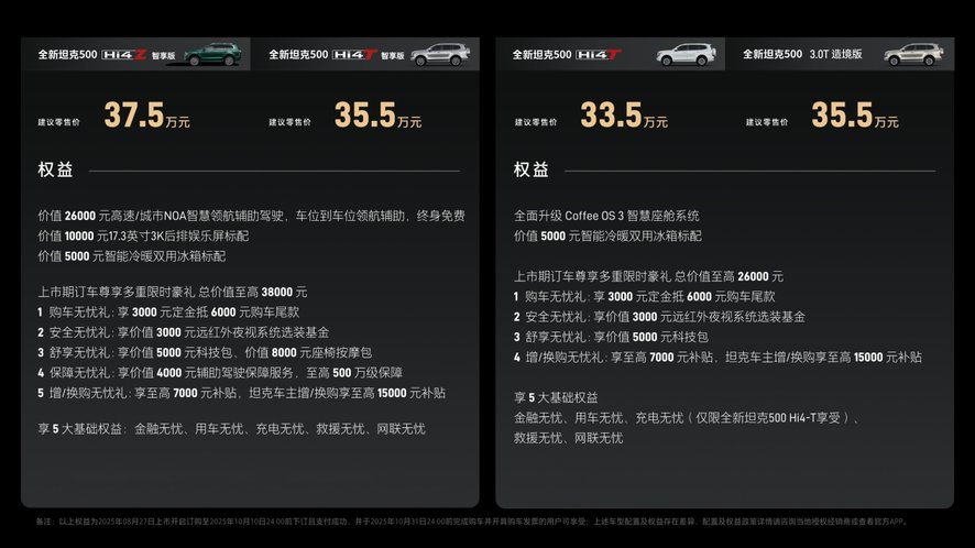 全新坦克500定位全场景智能豪华越野SUV,推出Hi4-Z、Hi4-T及3.0T V6燃油三种动力版本,其中Hi4-Z智享版37.5万元,Hi4-T智享版35.5万元,Hi4-T基础版33.5万元,3.0T造境版35.5万元,相比预售价格更具吸引力。